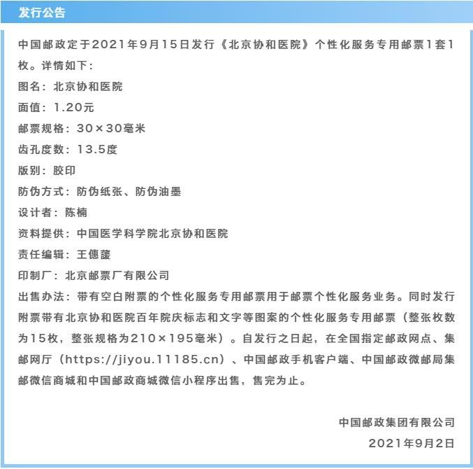 9月15日,中国邮政将启用本年度第三套个性化专用邮票——《北京协和医院》个性化专用邮票。